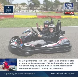 La Clinique Provence Bourbonne, en partenariat avec l’association « comme sur des roulettes » et RGKH Karting Handisport, organise une sortie Karting pour plusieurs de ses patients hospitalisés en rééducation le mercredi 11 octobre 2017 à Martigues.
